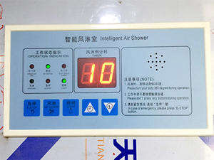 系統(tǒng)采用PLC自動化的控制手段,控制面板上LED顯示屏可正確顯示風(fēng)淋的運行狀態(tài)、雙門的互鎖狀態(tài)、風(fēng)淋周期進度和延時開門狀態(tài),并設(shè)有光電感應(yīng)器,單向通道風(fēng)淋室,從非潔凈區(qū)進入,關(guān)門后紅外線感應(yīng)有人就吹淋,吹淋后入門鎖閉,只能從出門走出風(fēng)淋室。